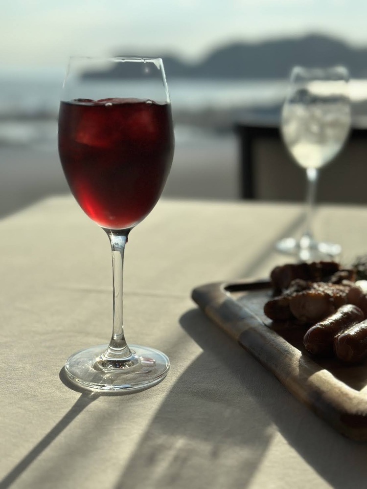 夕暮れ時にテラス席から眺める海と、グラス越しに見える夕陽は本当に贅沢なひととき。