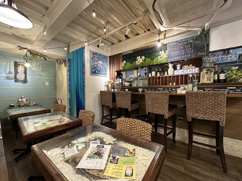 店内は、まるでハワイやカリフォルニアのビーチサイドに来たような、南国ムード漂う海雑貨&カフェレストラン。