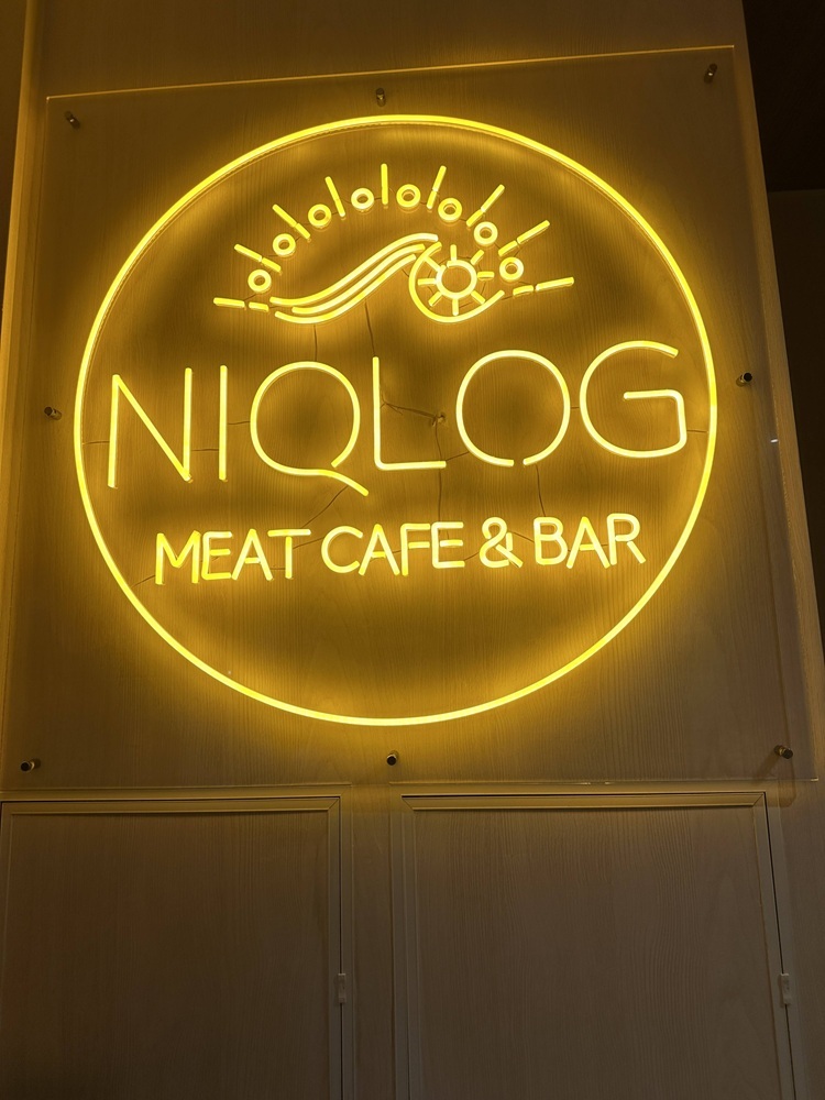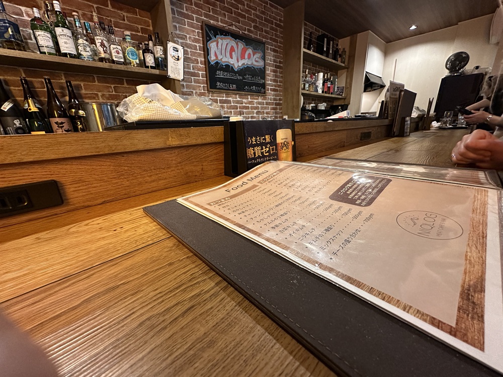 赤提灯や派手な看板というより、シンプルでクリアな看板が目印「NIQLOG」。店内に入ると、6席ほどのカウンターがメインで、小さなテーブルが2つ。