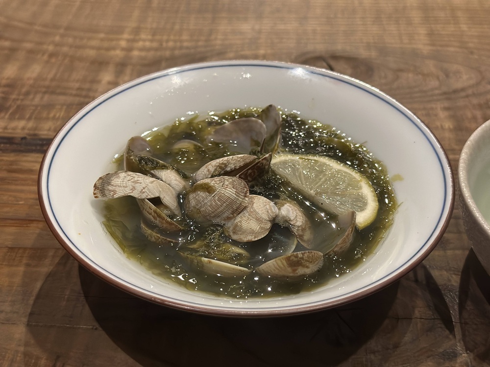 浅利と生海苔の吟醸酒蒸しは、体の芯からほっとする一品。